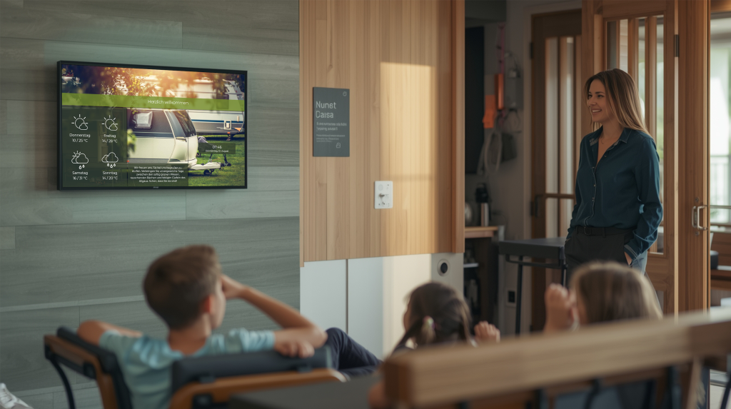 Anna denkt digital ganzheitlich. Neben der Gästemappe nutzt sie digitale Infopoints und den Infokanal, die Informationen an zentralen Orten zeigen, wie etwa im Aufenthaltsraum, an der Rezeption oder im Restaurant.