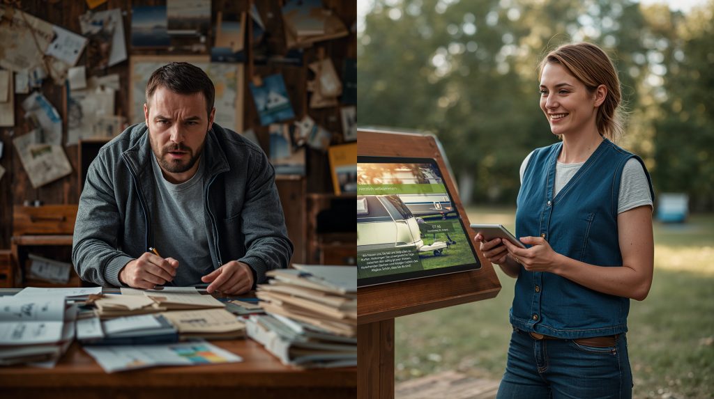 Zwei Campingplatzbetreibende, zwei Welten: Während Thomas morgens noch Bestellzettel sortiert, schickt Anna schon eine Info aufs Smartphone aller Gäste. Wie die Digitalisierung auf Campingplätzen mit Gastfreund den Alltag erleichtert und echte Gastfreundschaft sogar stärkt, erfahren Sie in diesem Artikel aus Thomas Perspektive.