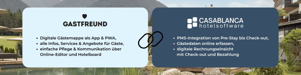 Durch die Schnittstelle zwischen Gastfreund und Casablanca sorgt für einen reibungslosen Informationsfluss zwischen Gast, Team und System – und macht Prozesse schlanker und nachhaltiger zugleich.