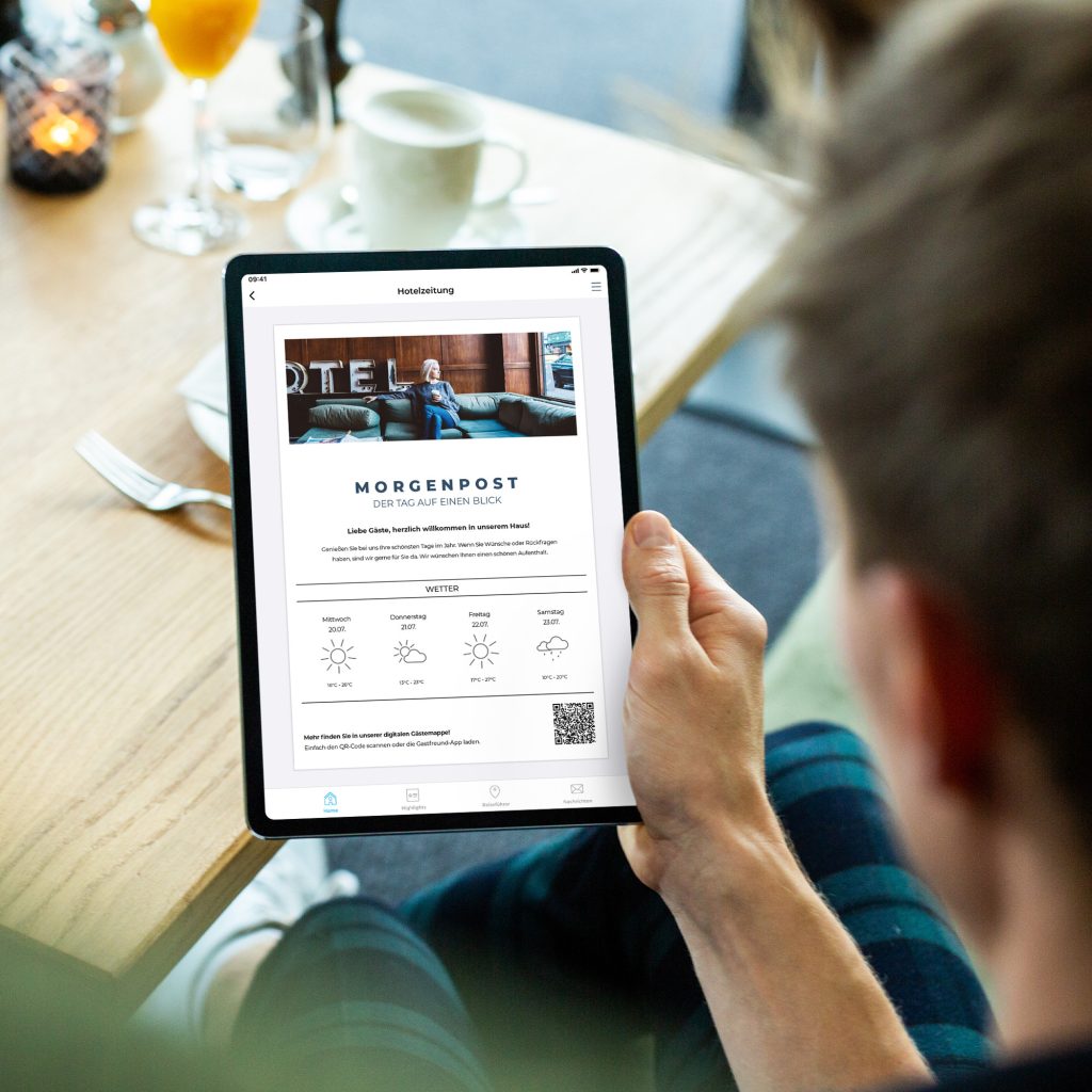 Die Hotelzeitung als Inspirationsquelle für ihre Gäste: Wetter, Ausflugstipps, Highlights und Angebote perfekt als Frühstückslektüre. Sie funktioniert als E-Paper und auf Wunsch auch gedruckt. Das Ergebnis: Gäste fühlen sich informiert und wertgeschätzt und entdecken Ihre buchbaren Zusatzleistungen.