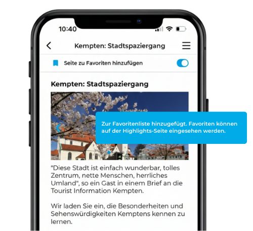 Mit der Favoriten-Funktion speichern Gäste Ausflugstipps, Routen, Veranstaltungen oder Events direkt in der Gästemappe. So finden Sie Inhalte jederzeit schnell wieder und stellen sich ihren Aufenthalt ganz individuell zusammen.