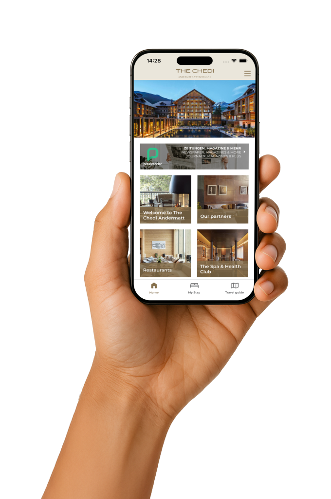 For The Chedi Andermatt, it quickly became clear that Hotelcore digital guest directory should become the centrepiece of guest communication – as a central communication and service platform, implemented as a separate, branded hotel app with the exclusive look and feel of the hotel. Guests can access content via the native app or the web version (progressive web app), depending on their preference.